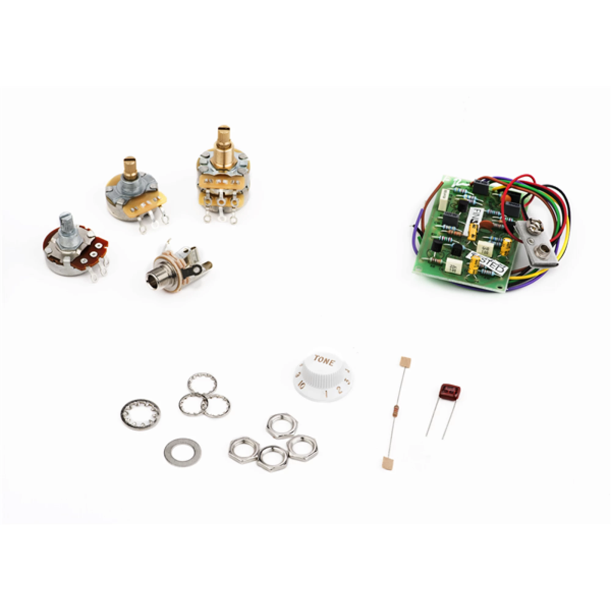 Kit includes primary PCB board, TBX Tone Potentiometer, Volume and Tone Potentiometers, output jack, capacitor, 1/4 watt resistor, and control mounting washers and nuts. Will work with virtually any Stratocaster pickups. Kit does not include pickups or pickup selector switch.