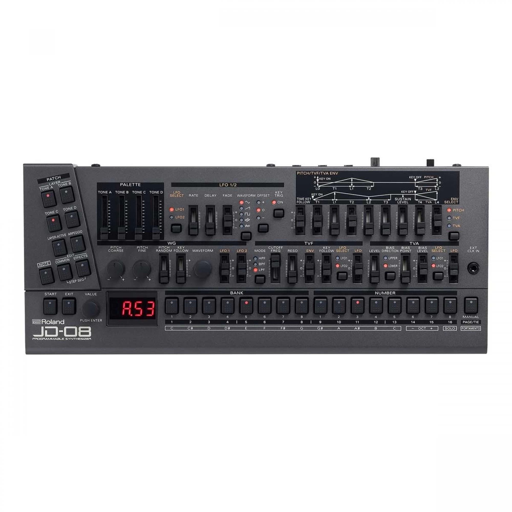 With its retro workflow, evocative sounds, and powerful effects, the JD-800 was a favourite for top electronic music producers through the ’90s and beyond. Combining the original JD-800 waveforms with advanced modelling techniques, the JD-08 delivers the exquisite hands-on sound design of the original, along with hugely expanded polyphony, a two-part polyphonic sequencer, and other modern updates.